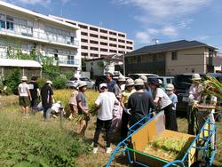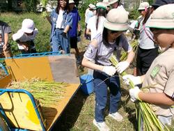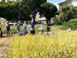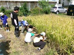 豊かに実った稲穂をクラスごとに1時間ずつかけて、稲刈りをしました。稲刈りを体験した子供たちに感想を求めると「狩る時に力が入ったが、サクッと刈り取れた時はとても気持ちが良かった」と答えてました。今後は乾燥させ、白米にし、家庭科の時間でこの白米を焚いて家庭科室で食べる予定です。