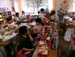 お菓子の箱、せっけんの箱、大きさや形の違った様々な箱を家から持ち寄りました。授業では箱の形に着目して、仲間分けをしました。