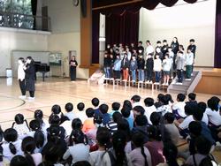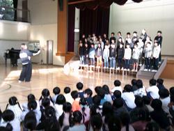 明日6年2組が和光市を代表して南部音楽会に出場します。今日はその時に合唱する嵐さんの曲「ふるさと」を全校の前で披露しました。朝一番だったので、声が出にくかったですが、きれいなハーモニーを奏でていました。明日、大舞台で今までたくさん練習してきた成果を発揮してくれることを期待しています。