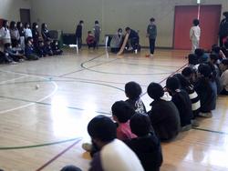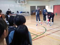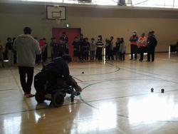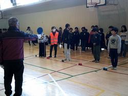 福祉共育の学習で1時間目は講師の方の講話を聴き、2時間目は実際にポッチャを体験しました。白色のジャックボールにどちらが(赤ボールグループ、青ボールグループ)近くに投げられるかという競技でした。初めての経験だったので子ども達からは「ボールが重くて、うまくコントロールできなっかった。」等の感想が上がっていました。