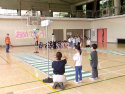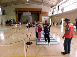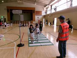 道路安全課、地区社協の協力のもとで交通安全教室が開催されました。かけ声は「手を挙げて、右見て、左見て、また右見て、信号を見て」で、横断歩道を渡る練習をしました。